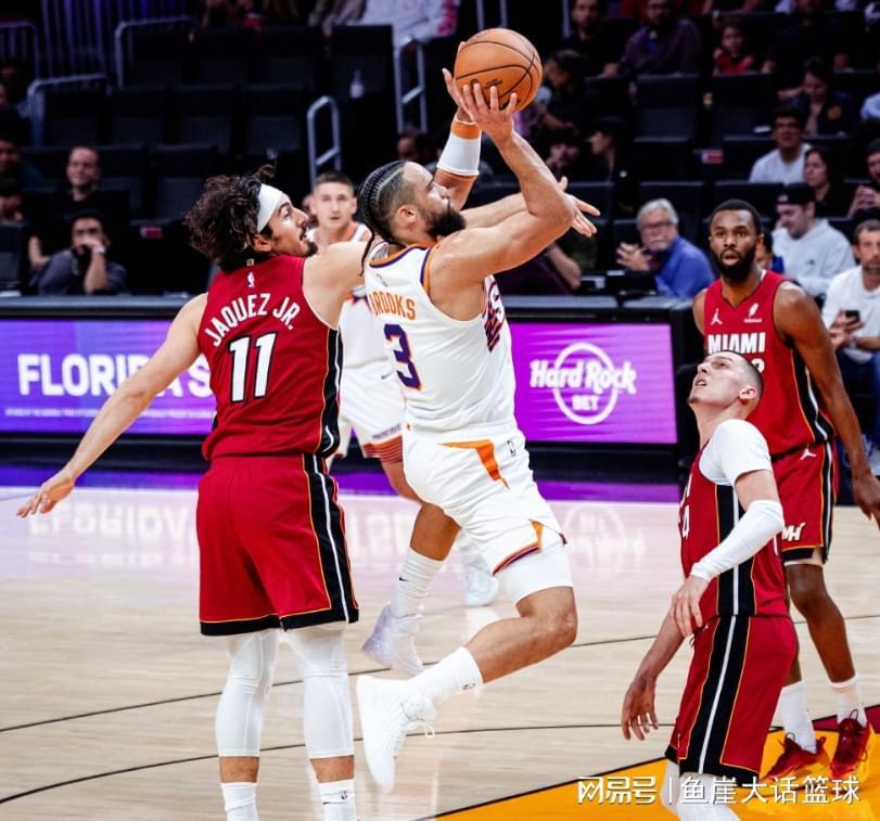 第一节比赛阿德巴约投篮命中,布克投篮得分后阿德巴约命中三分,吉莱斯皮命中三分后希罗突破得分,本来之后布克帮助太阳紧咬比分,可后续维金斯、米切尔慢慢帮助热火取得领先不说,等到狄龙三分频频打铁的时候,希罗、阿德巴约相继命中三分扩大领先,虽然后续阿伦三分开火缩小分差,但是鲍威尔、韦尔也给予回应,第一节比赛结束热火领先8分。第二节比赛热火打出一波12-4,后续吉莱斯皮、马威虽然能够得分,但是阿德巴约、希罗给予回应,等到狄龙进攻爆发的时候,鲍威尔三分也开火,米切尔命中三分后热火领先15分。接下来的比赛太阳挡不住热火进攻,阿德巴约、鲍威尔继续扩大领先,半场比赛结束太阳落后17分。